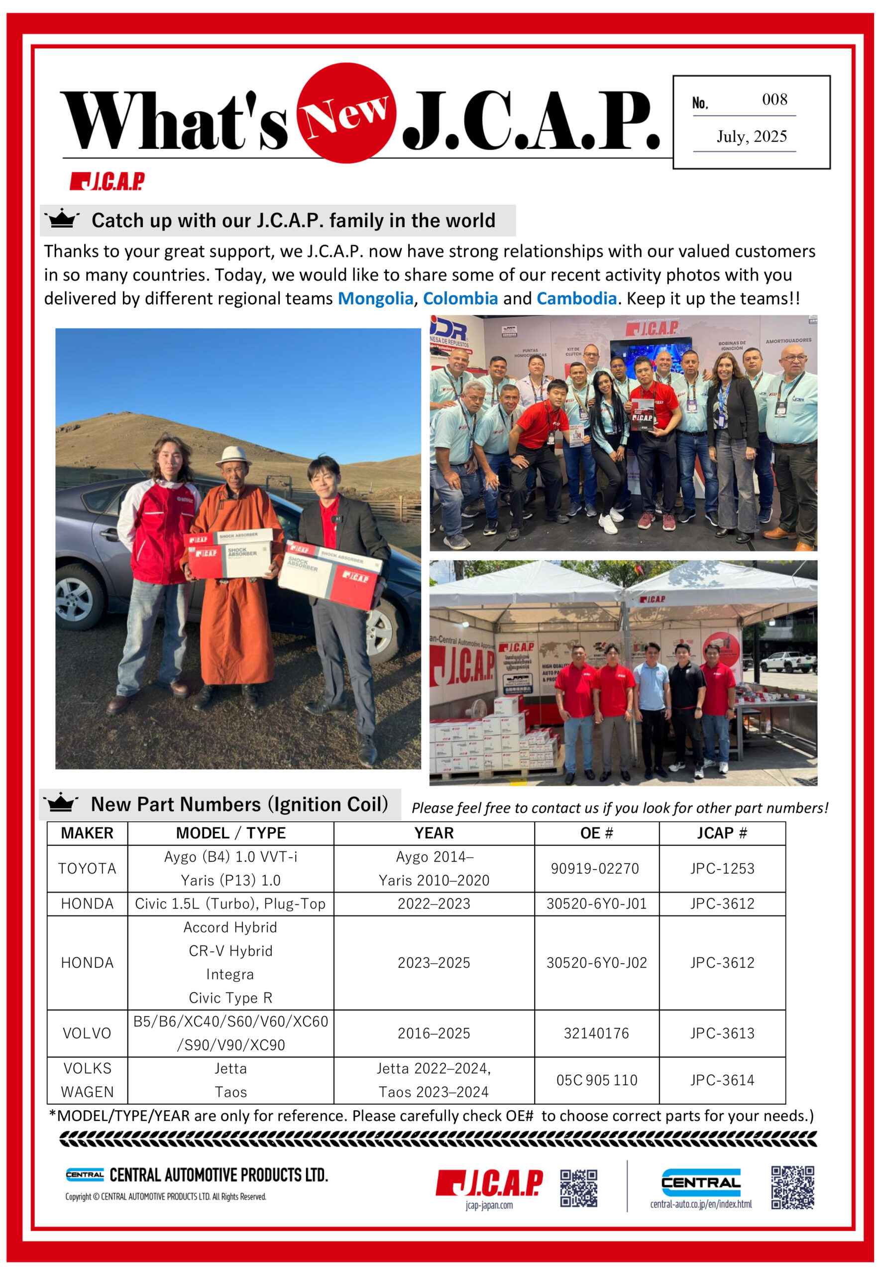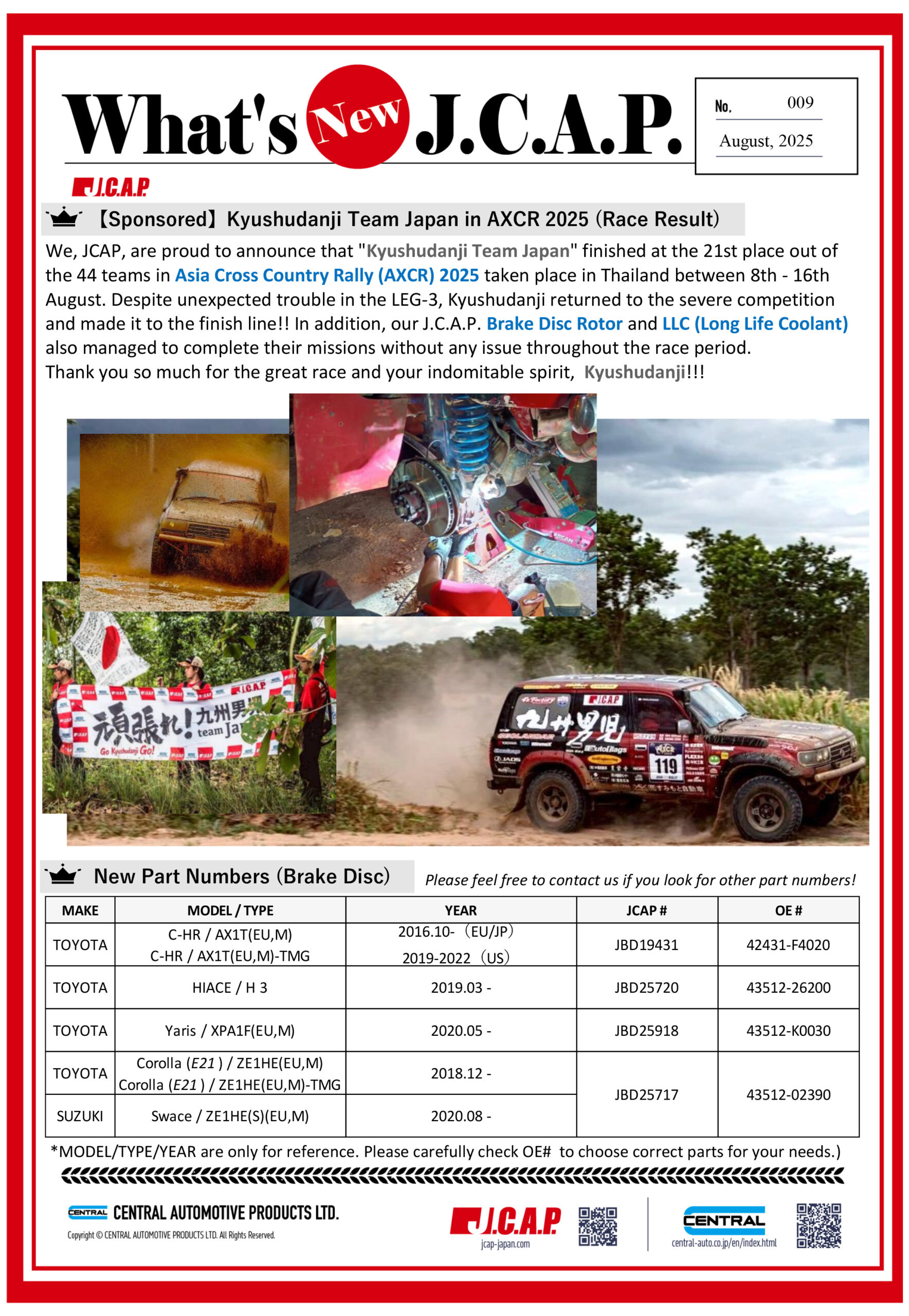 Check out our recent activities with valued customers worldwide as well as how our J.C.A.P. Brake Disc Rotor and LLC managed in Asia Cross Country Rally (AXCR) 2025!! You can also download the letter in PDF here. (Vol.8 and Vol.9)